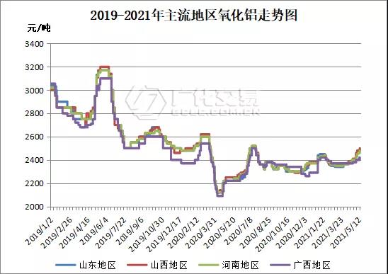 3、5月份以來,主流地區(qū)氧化鋁價格均出現(xiàn)不同程度的上漲,幅度在40-100元/噸。截止5月19日,山東地區(qū)主流價格2440-2500元/噸,山西地區(qū)主流價格在2400-2500元/噸,河南地區(qū)主流價格在2440-2480元/噸,廣西地區(qū)主流價格2400-2440元/噸,貴州地區(qū)主流價格在2390-2410元/噸。