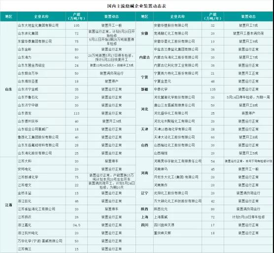 1、5月份山東、江蘇、河北、河南等地區(qū)均有氯堿企業(yè)有檢修計劃,裝置開工下降,市場貨源供應也將減少。